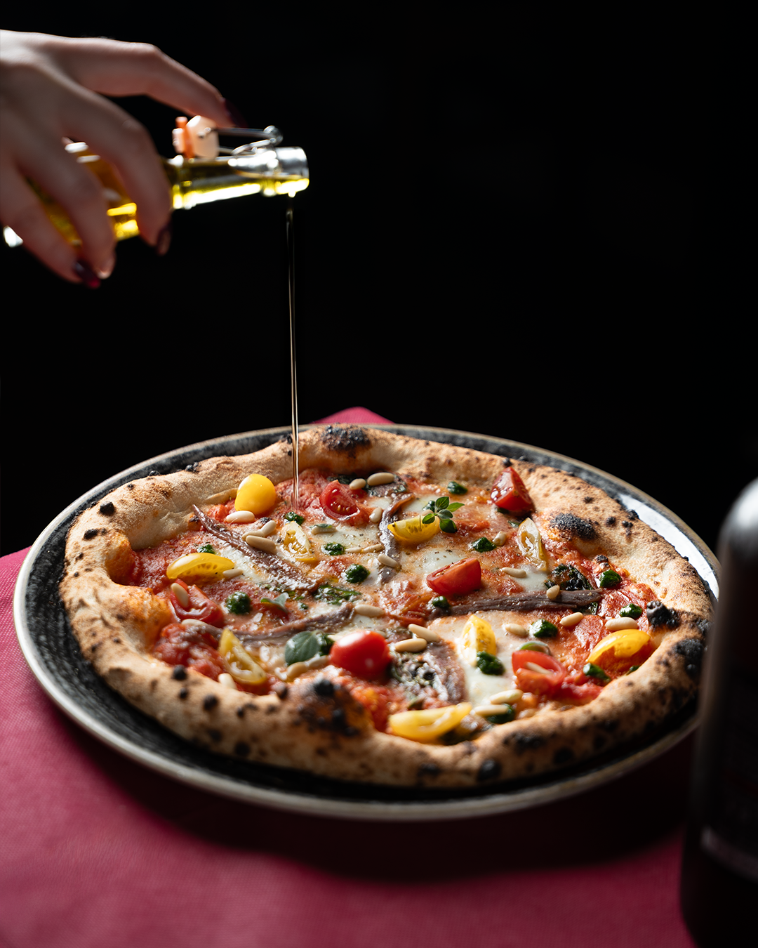 (Base margherita: pomodoro San Marzano, bufala campana DOP, alici del Cantabrico, gocce di pesto di rucola, bis di pomodorini gialli e rossi, pinoli, olio EVO, origano e basilico)